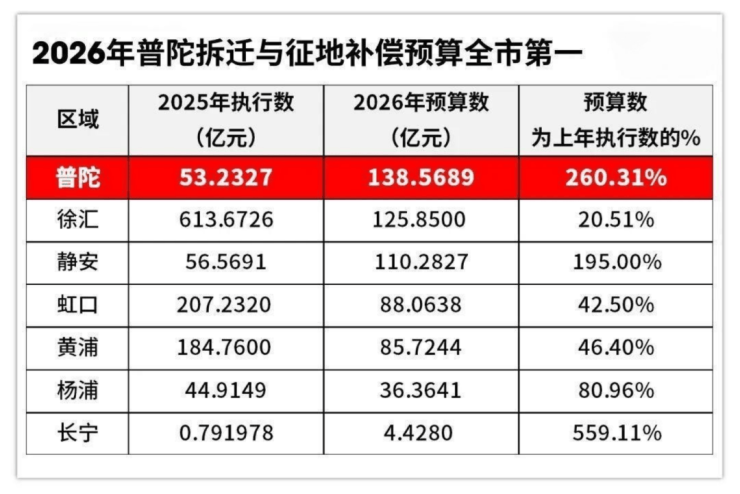 其次,2026年普陀拆迁与征地补偿预算高达约138亿,全市最高。真金白银投入之下,普陀城市界面、市政配套将迎来新一轮大幅升级,区域发展全面提速。