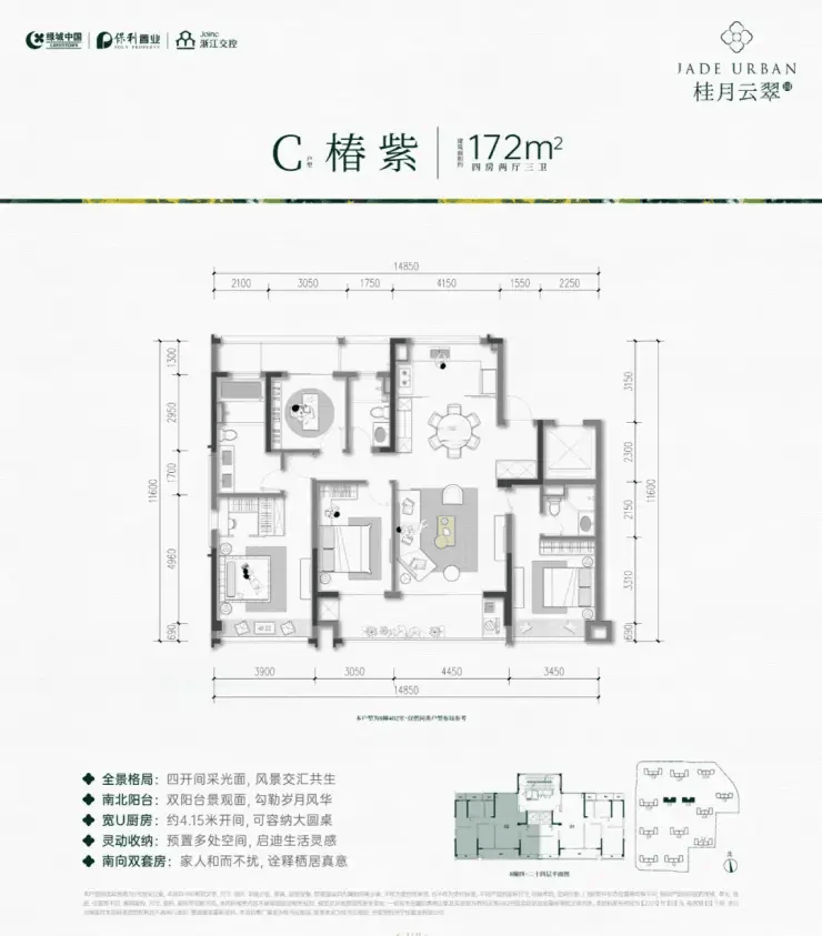 172㎡ 650–680万元 38,000–39,000元/㎡ 四房两厅,大面宽客厅,主卧套房,景观溢价 稀缺顶层户型,仅余数套