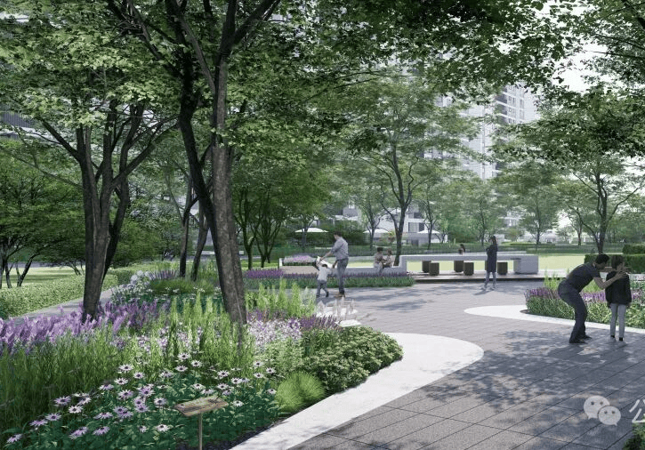 约4000㎡森林光影会客厅,以特色种植、对景景墙、植物认知花园、会客廊架、户外阅读、休闲平台6大主题为主,打造围合式社区精神核。同时与架空层联动,形成多功能空间场域,满足邻里会客、休憩、观景需求。