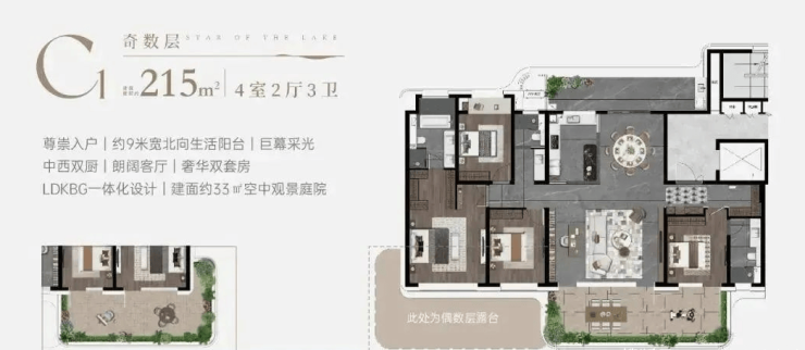 主力户型:建面约150㎡–240㎡滨湖大平层,主打4居、5居空间格局,户型方正,得房率高,户户赠送15–35㎡超大露台(不计入产权面积),可自由改造为空中花园、家庭影院或宠物空间。