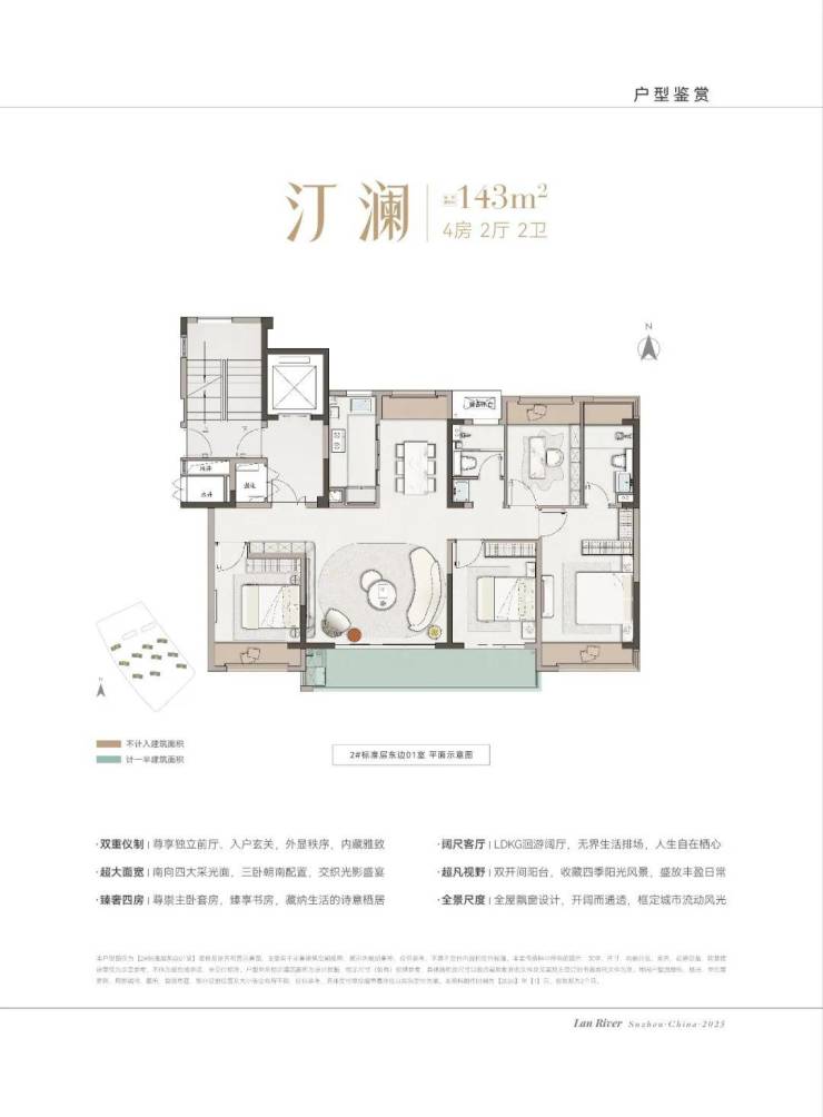 双河交汇景观:项目正对胥江与京杭大运河交汇处,270°滨水视野,推窗即见水岸风光,苏州主城稀缺资源。