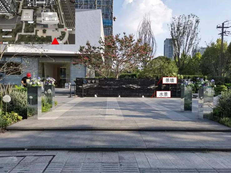 下图,人行入口一,正对景墙和水景。