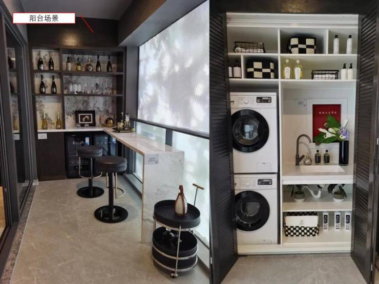 下图,花重金打造的阳台两侧,两个场景,这是176㎡样板间的。