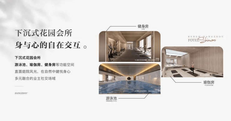 出则繁华入则宁静,FOTEL漫游园林体系,会所配备:恒温泳池、瑜伽室、健身区,下沉式庭院