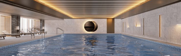 在大平层区专属的地下会所内,恒温泳池、健身房、书吧巧妙地融合于翠绿林木与潺潺跌水之间,且均具备自然采光条件。