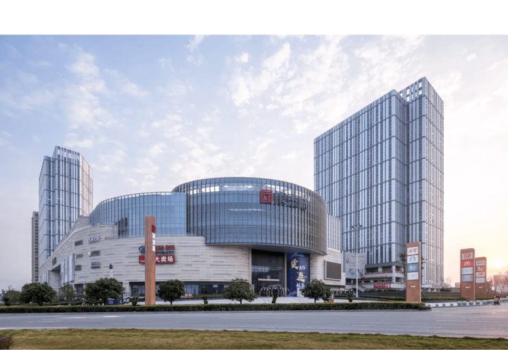 建筑采用四面铝板+三玻两腔Low-e玻璃幕墙,搭配飞檐歇山顶元素,在简约中透出东方雅韵;