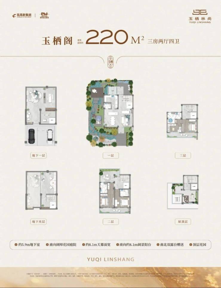 约220-320㎡联排产品,创新打造“双庭院+附赠空中双露台”,昆山罕见首层挑高客厅及南北双向地下室采光井等高定空间,实现“出则繁华,入则静谧”的院墅生活范本。