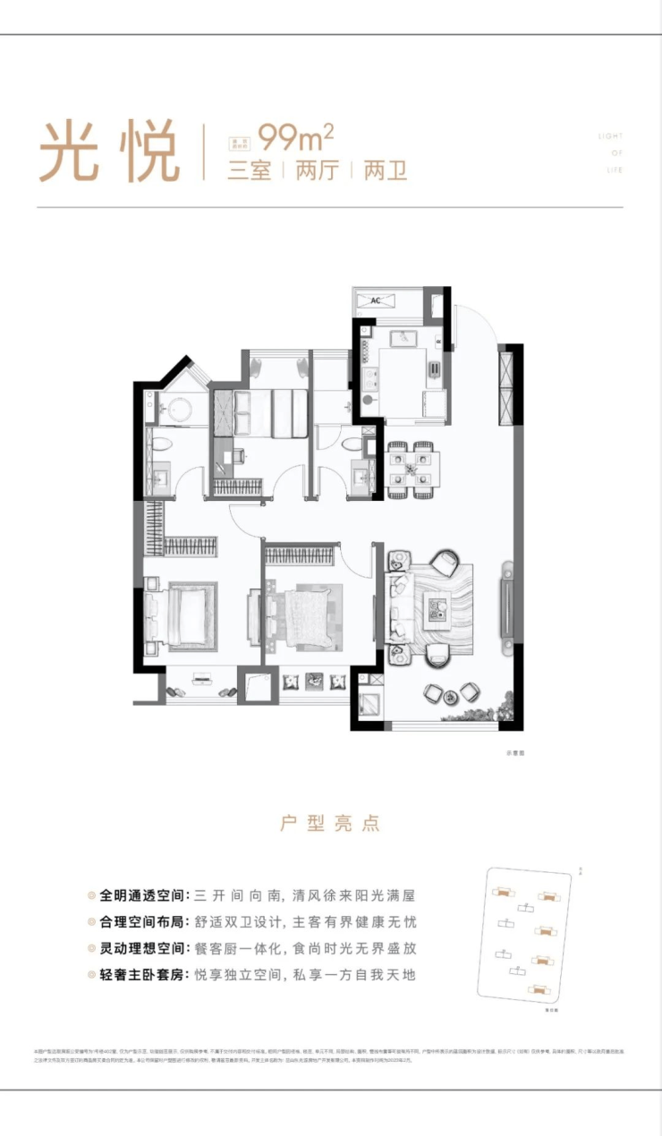 翡翠兰亭花园提供多种户型选择,包括99平方米的三室两厅两卫、119平方米的三室两厅两卫以及143平方米的四室两厅两卫。这些户型设计合理,南北通透,厨卫全明,且都配备了全景飘窗和南北双阳台,采光和通风条件极佳。特别是99平方米的户型,实得面积媲美市面110平方米的产品,性价比极高。