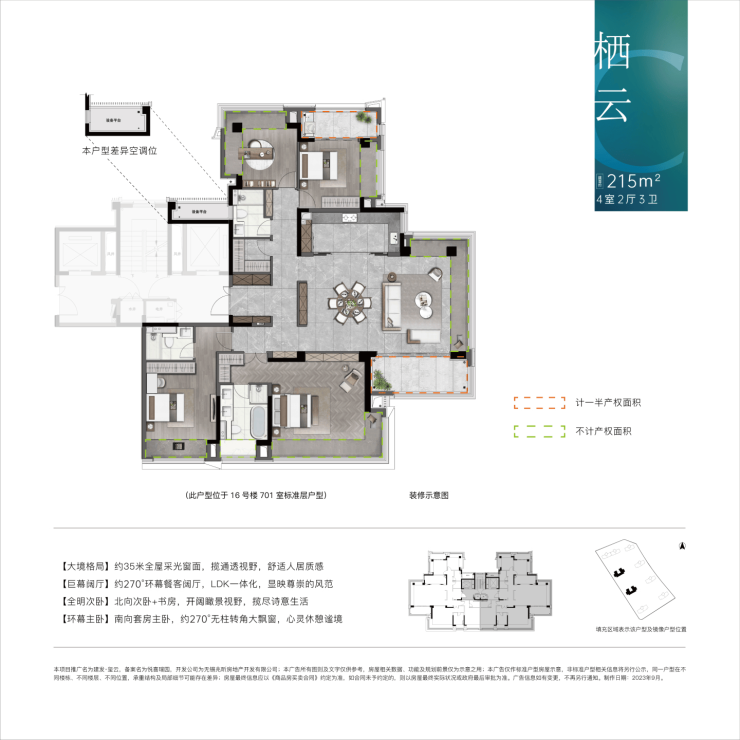 215㎡ 四室双套房 720 – 763 33,500 – 35,500 顶层改善,带独立主卧卫浴,私密性极强