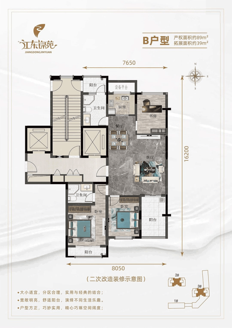 得房率:部分户型得房率超100%(通过LOFT设计实现空间倍增),整体得房率65%以上。