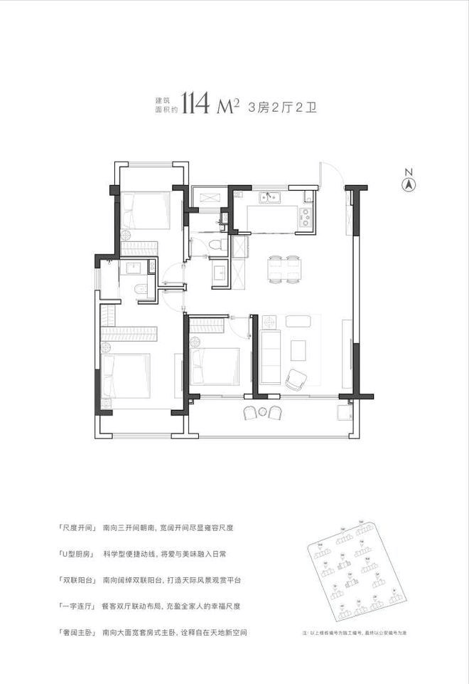 户型面积:89㎡、99㎡、114㎡三房,主打三开间朝南、主卧套房、瞰景飘窗等设计