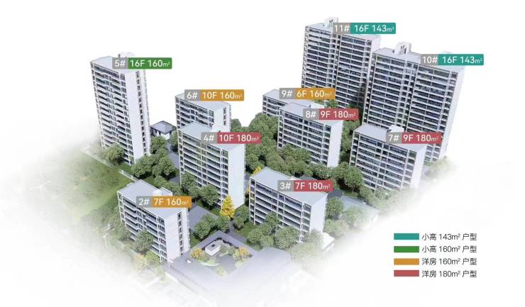 主力户型 :建面 143㎡、160㎡、180㎡ 四房,均为 南北通透、LDKB一体化设计 ,主卧配270°转角窗,部分户型设双台盆、独立衣帽间,得房率超 80% 。