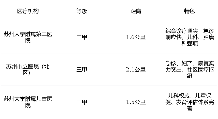 ✅ 在苏州主城区,1.5公里内拥有 三家三甲医院 ,且覆盖妇儿、综合、急诊,极为罕见。