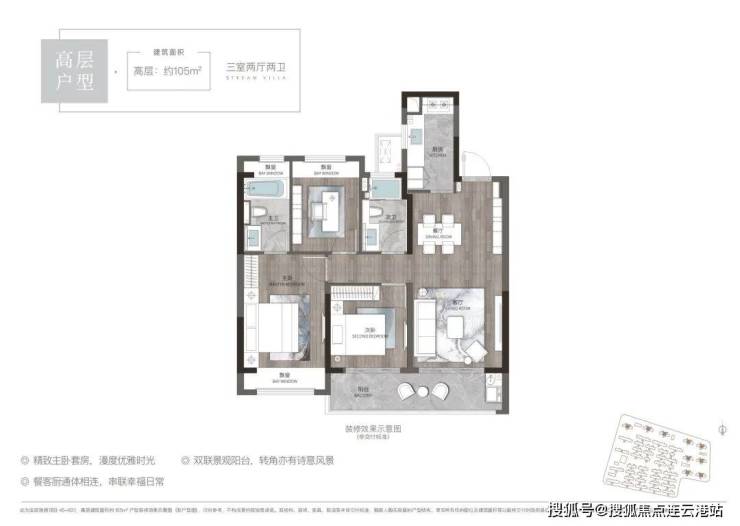 高层105平户型:三室两厅两卫,总价158万-170万