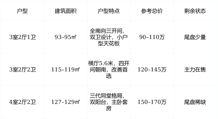 项目已于 2023年7月全面交付 ,目前为 现房销售 ,无在建楼栋,房源为尾盘清售状态。主力户型 93–129㎡ ,毛坯交付,参考均价 约11,500元/㎡ ,总价区间 90–170万元 ,适合刚需与改善家庭 拎包入住 ,无需等待。