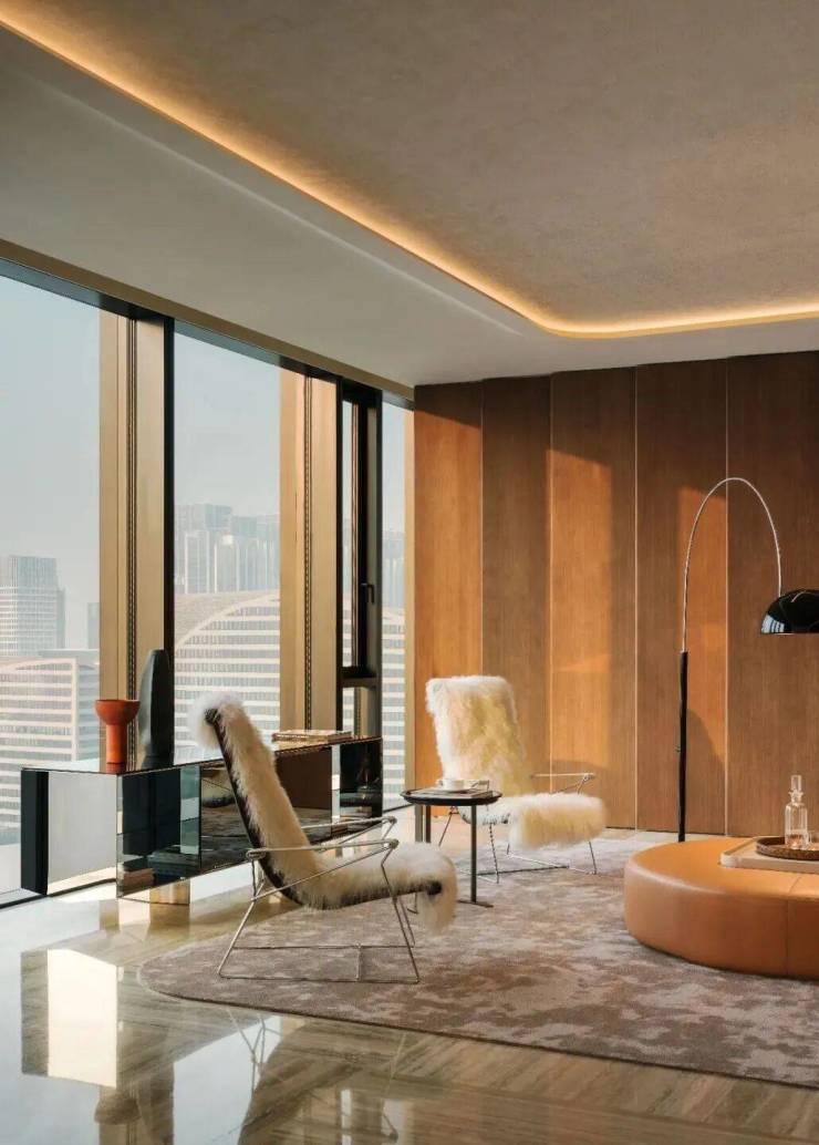而有着同样优雅弧度的Maxalto Lilum米白色沙发,围合出慵懒安然的观景位,搭配一旁B&B Italia的J.J.单椅,金属的利落与羊毛的柔软温暖相拥,便有了或自在对谈、或看尽城市天际的悠然。