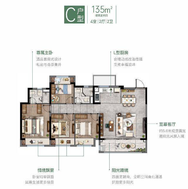 135㎡:四居室,空间阔绰