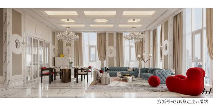 新古典风格装标约2.1-2.5万/㎡,配意大利鱼肚白大理石、法国真丝墙布、巴卡拉水晶吊灯等