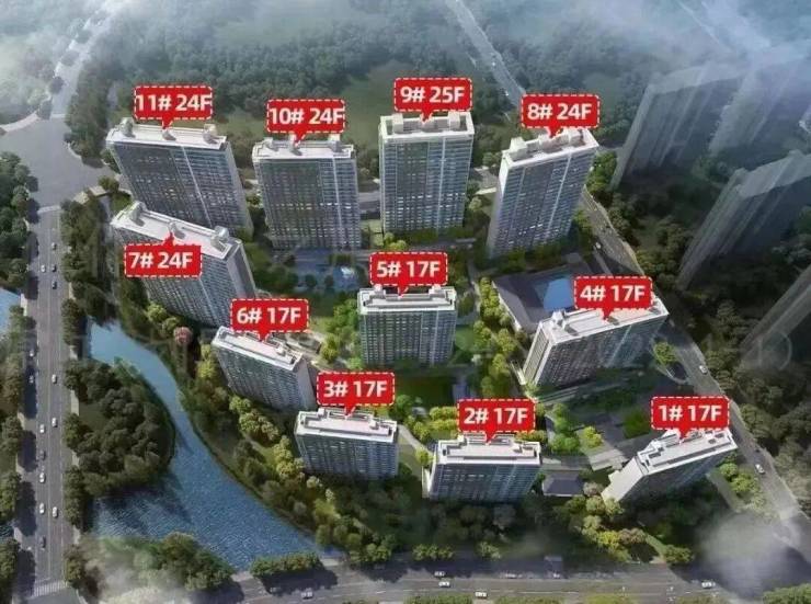 湖滨铂悦花园总建筑面积约17.5万㎡,11栋17-25F高层南低北高有序排布。2.3的容积率,45%的绿化率,温暖的社区中岛大花园,开发商把更多的空间让渡给了绿化。