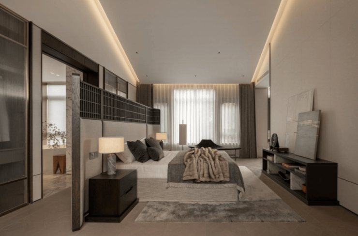 三楼是对标高端度假酒店的总统套房设计,将舒适发挥到了极致,卧室、衣帽间、书房、收藏室、温泉泡澡式卫生间和休闲阳台一应俱全。这里可以是业主「私人第二客厅」,体验一种把超大地上花园搬到了空中的顶豪墅级生活。