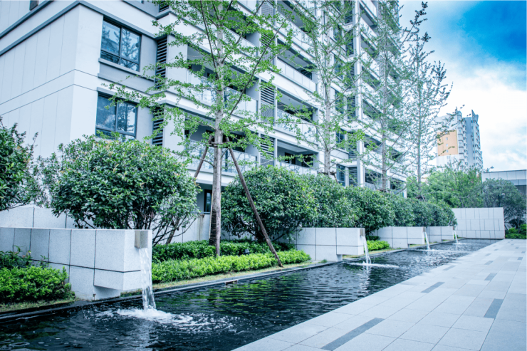 进入园区,高颜值建筑立面映入眼帘,米白色与浅灰色的外立面典雅大方,搭配大面积的宽幕玻璃彰显艺术美学格调,在多重绿意交织渗透,建筑与绿荫花影疏密有致,保证采光与自然低密,呈现更高品质的生活。