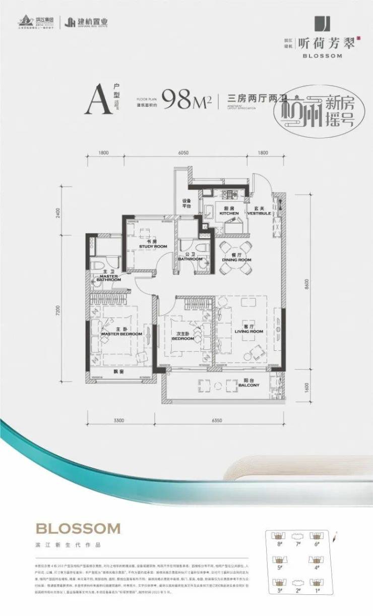 约98㎡拥有三开间朝南、约6.3米宽景阳台、主卧套房,让人生第一套,享受舒适朗阔空间。