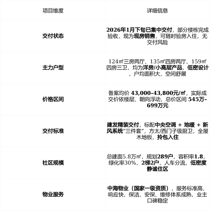 在售状态2026年1月下旬集中交付 ,现为 现房销售 ,剩余主力户型为 124–159㎡洋房/小高层 ,备案均价 43,000–43,800元/㎡ ,总价 545万–699万元