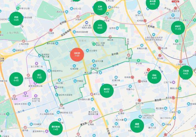 金虹桥板块,虽然归属闵行区,但它自有一层“镀金”——金虹桥板块与古北紧紧相邻,沾了古北的光,又因地理位置比闵行区其他板块相比,更贴近市中心。地处闵行、徐汇、长宁三区交汇处,被漕河泾开发区、大虹桥、徐家汇等人才聚集地包围。