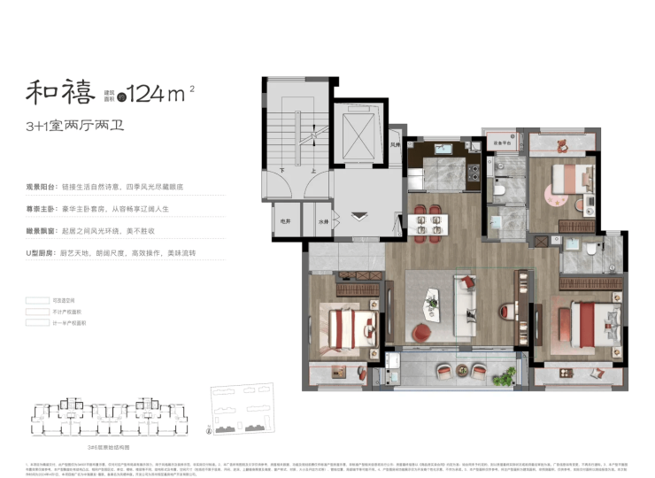 户型面积空间配置产品类型参考总价得房率124㎡;3+1室2厅2卫小高层;395万-440万;78%
