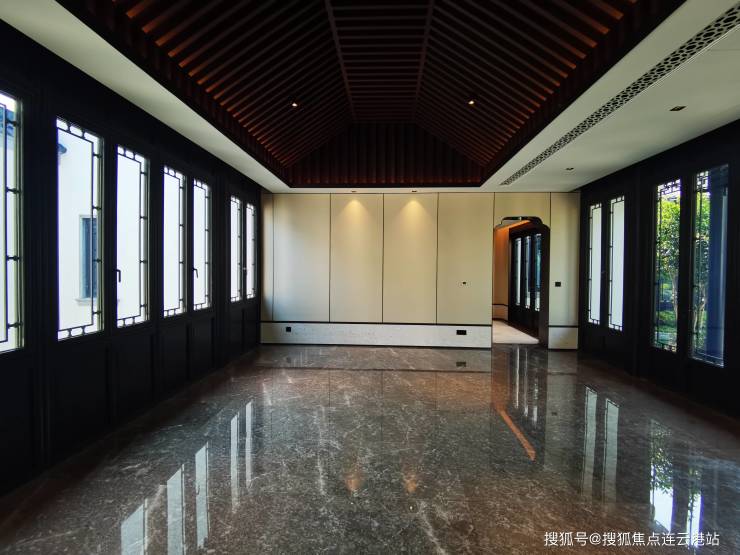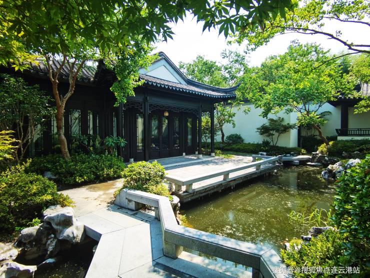 复刻明清“四水归堂”形制,白墙黛瓦木纹格栅立面,由苏州园林设计院执笔庭院景观