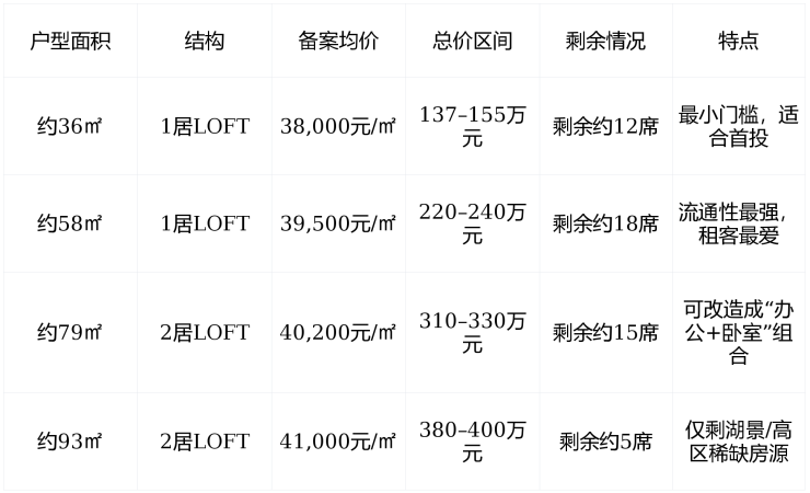 主力户型 :36–93㎡ LOFT公寓,层高 4.5米挑高 ,买一层=享两层