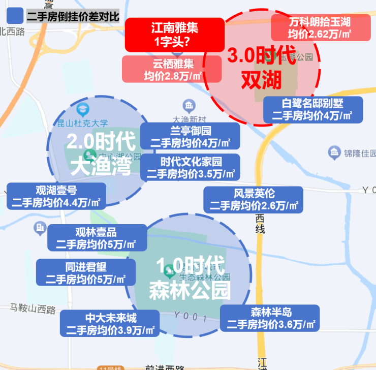 从图中数据可以清晰看出,与城西老核心二手房相比,双湖的新房价格有着极大优势,最大价差近2.5万/㎡,竟然高达一倍之多。