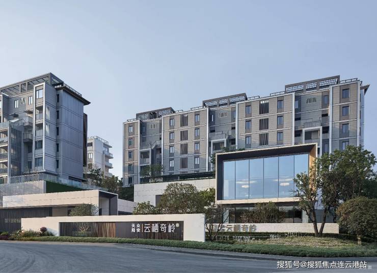 新中式灰墙黛瓦立面,融合全景玻璃幕墙,坡地台地式布局