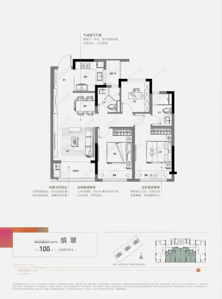 96㎡三房两厅两卫:南北通透,双阳台配置,客厅面宽约3.6米,主卧套房设计,配备独立卫生间与衣帽间。