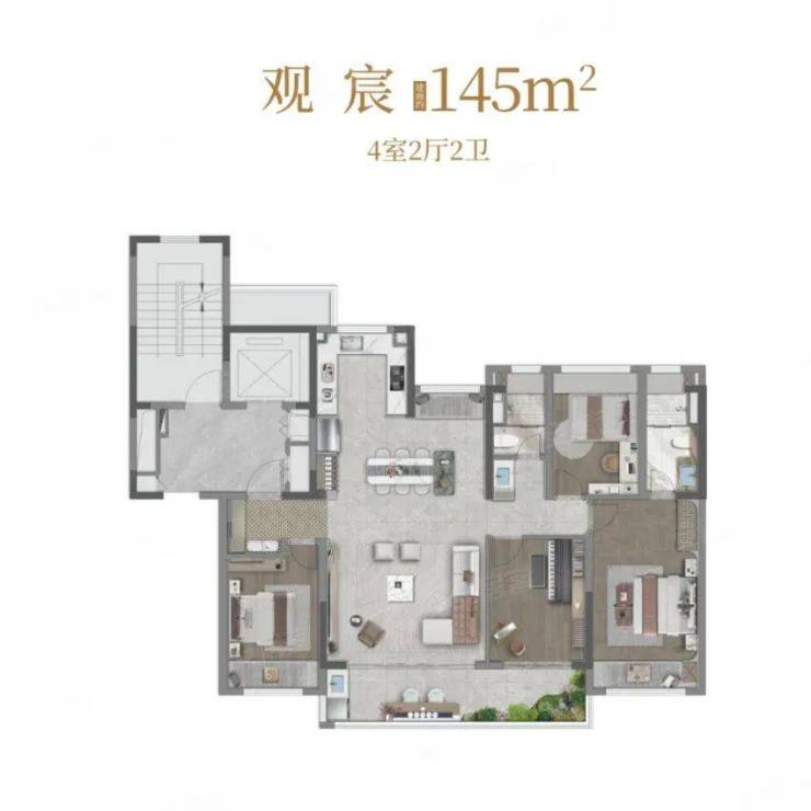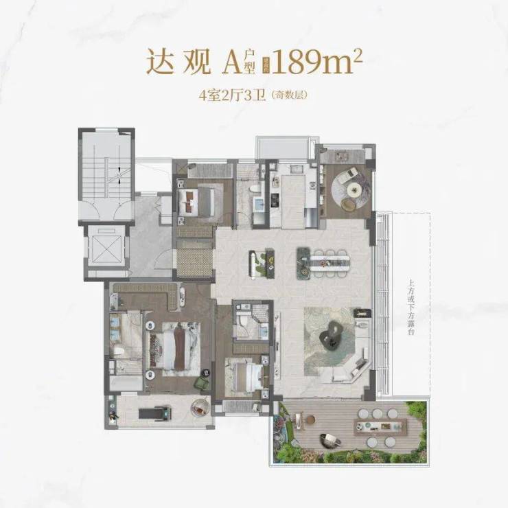 洋房:建筑面积145-189㎡,部分为第四代空中院墅创新设计,精装交付(装标3000元/㎡),总价441-1052万元