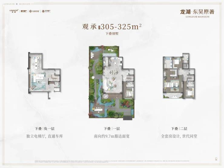 联排别墅:建筑面积305-550㎡,独门独院设计,配备6.9米地下挑高及80-310㎡私家院落,总价1448-1856万元