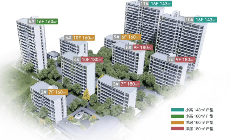 户型配置:建面约143m²、160m²、180㎡