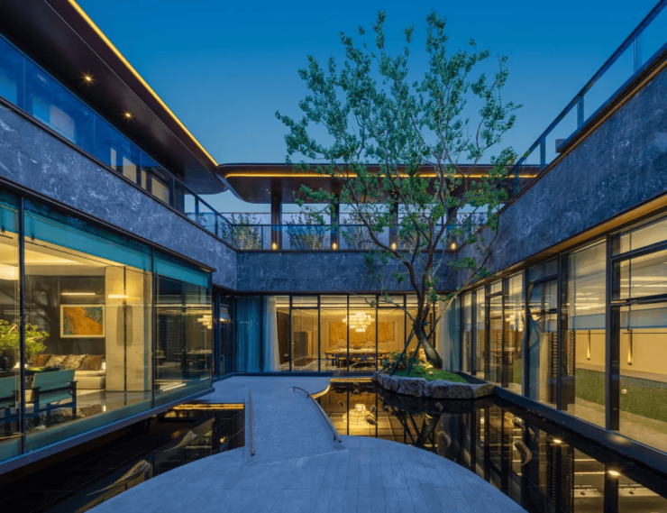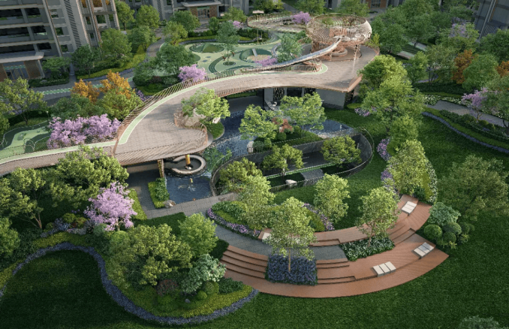 小区中央打造超大绿地与水景庭院,结合风雨连廊,营造“可游可赏、可玩可憩”的沉浸式社区环境。