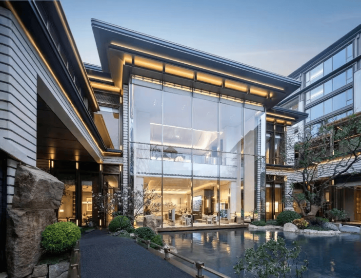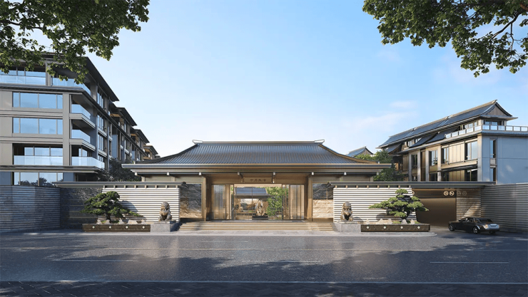 大门设计灵感源自良渚玉琮,采用故宫太和殿同款庑殿顶,彰显尊贵气质