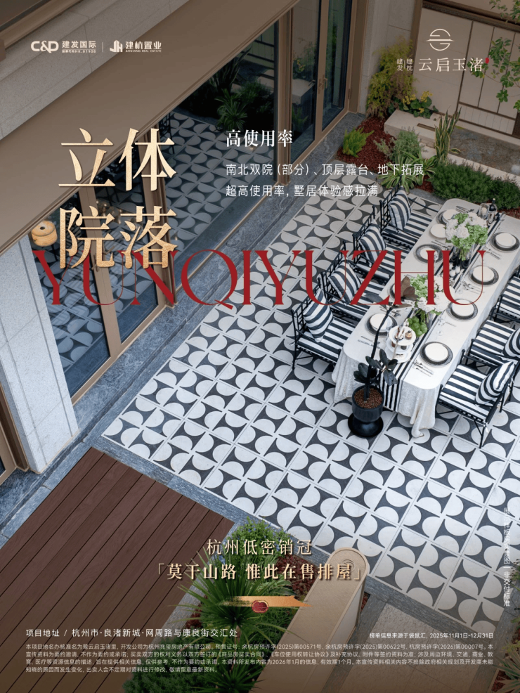 建发建杭·云启玉渚是位于杭州余杭区良渚新城核心的一处稀缺纯低密墅区,由建发集团与建杭置业双国企联袂打造,主打“有天有地有庭院”的改善型叠墅与排屋产品,容积率仅1.2,是当前大城西主城范围内罕见的低密人居标杆。