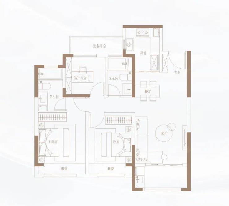 138㎡户型开间阔绰,4室2厅2卫,三房朝南,均赠送飘窗。