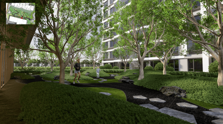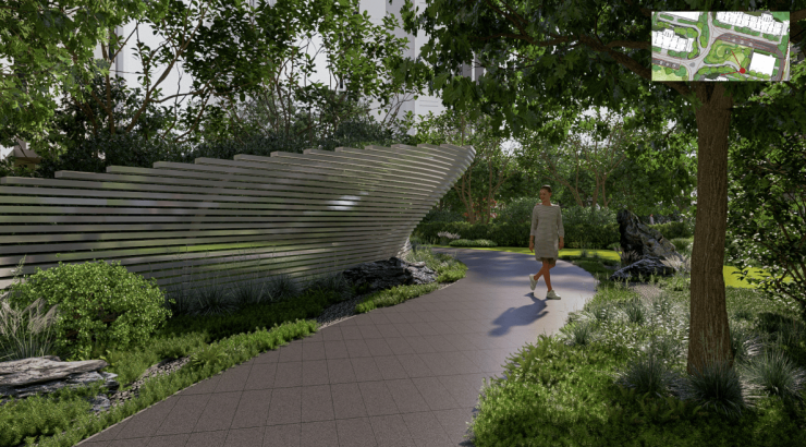 项目采用现代简约的建筑风格,通过加宽门头设计,彰显品质感细节,强化归家的仪式感和尊贵感。园区内依托线性公园理念,将三个地块有机链接,打造仿自然场景的景观空间。社区内设有3000平方米的公共空间,将宅间花园、健身区、室外会客厅等融为一体,让生活充满活力。