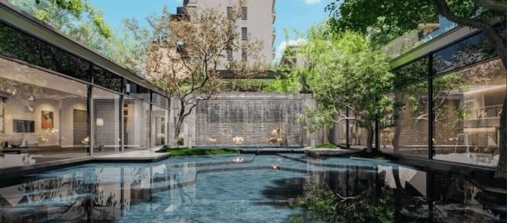 采用"一轴三进"新中式园林布局,中央景观轴长达120米