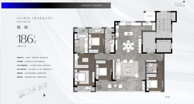 186㎡户型主要在尺度上有所升级,同时也做了3卫双套房设计。