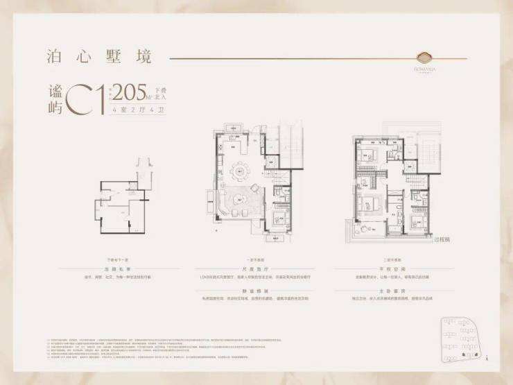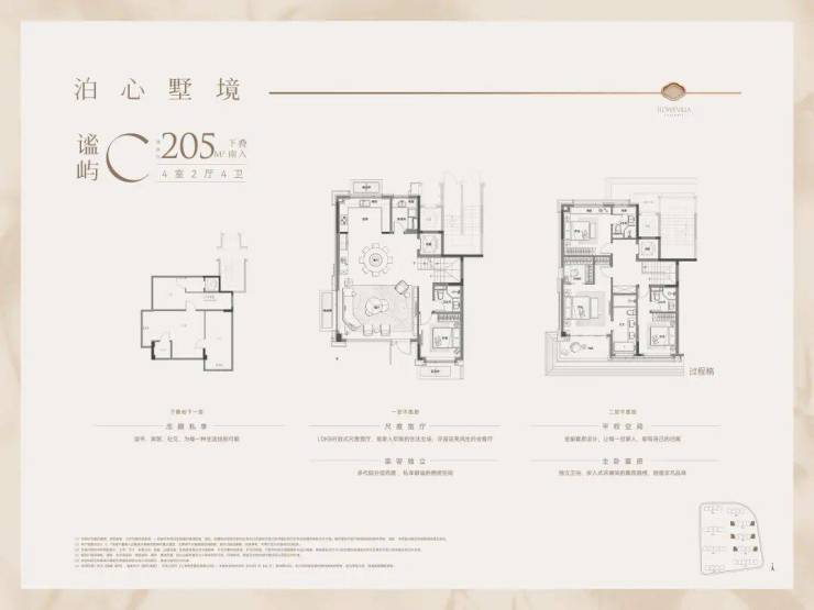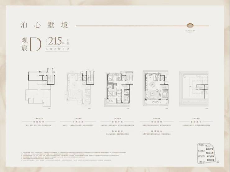 建面约216㎡上叠:三层全套房卧室设计,客餐厅位于视野更好的四层