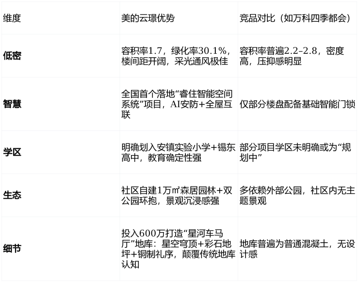 美的云璟不是简单的住宅产品,而是一套“低密+智慧+学区+生态+服务”五维一体的系统性生活方式解决方案。在锡东新城房价普遍2.1–2.3万/㎡的背景下,其产品力与品牌背书形成显著溢价能力。