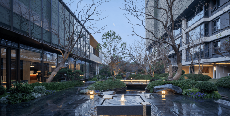 社区内部景观:打造240米贯穿式水景中轴、八境园景及林荫步道,融合南宋《水图》意境,营造东方诗意居所。