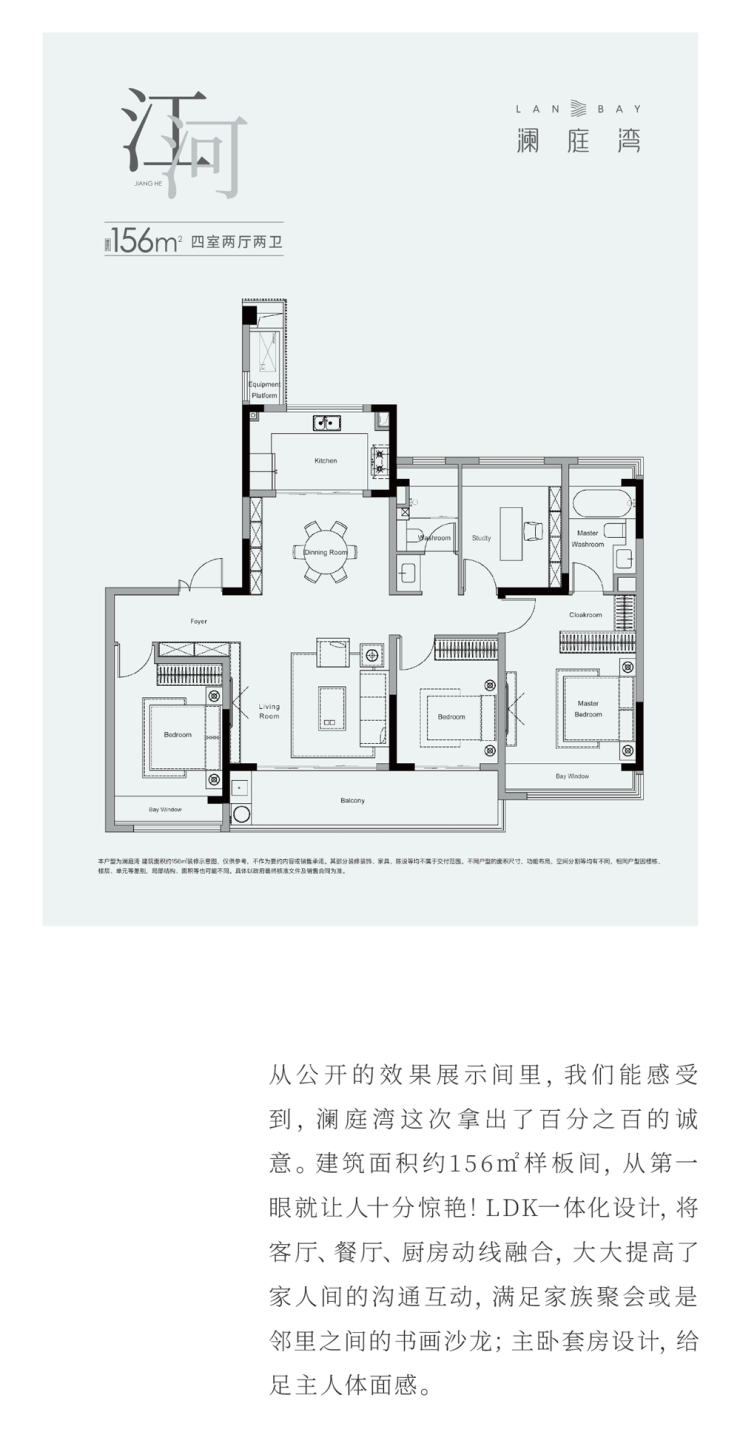 户型设计:社区户型极度纯粹,仅有建面约 152㎡和 156㎡的四房两厅两卫一种主力户型。采用南向四开间设计,面宽约 14.6 米,配备约 7.6 米的超尺度瞰景阳台,户户享有无遮挡的江河景观。