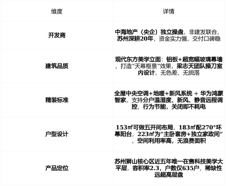 核心优势中海独立操盘 + 华为鸿蒙全屋智能 + 地铁5号线500米 + 狮山核心区稀缺大平层 + 2400㎡下沉式会所 ,苏州高端改善市场“科技+美学”双标杆。
