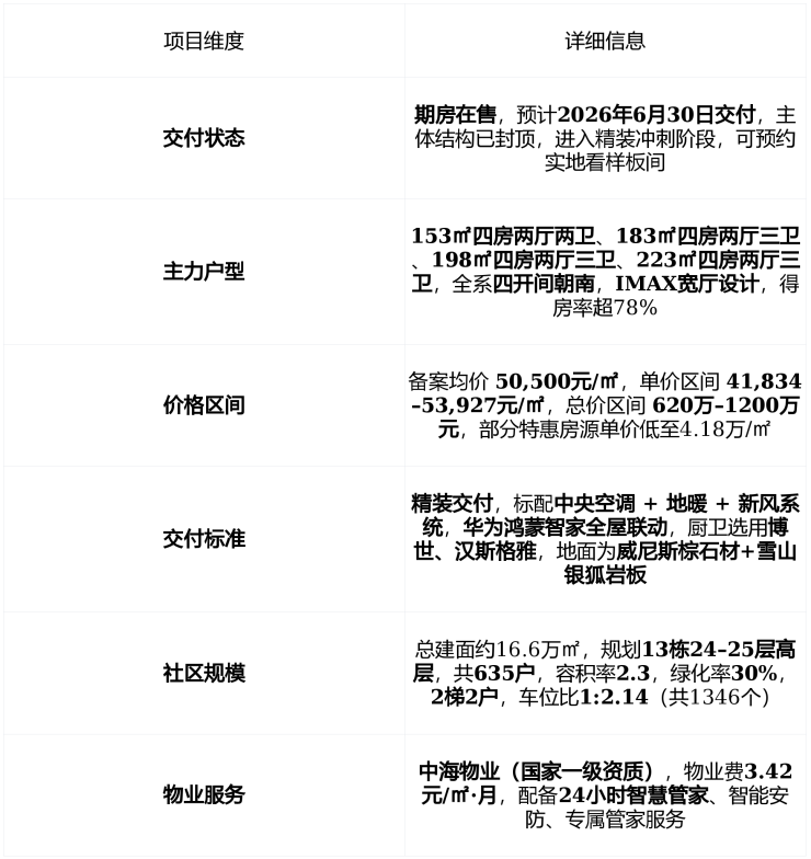 在售状态期房在售中 ,预计 2026年6月30日交付 ,剩余主力户型为 153㎡、183㎡、198㎡、223㎡科技美学大平层 ,备案均价 50,500元/㎡ ,总价 620万–1200万元